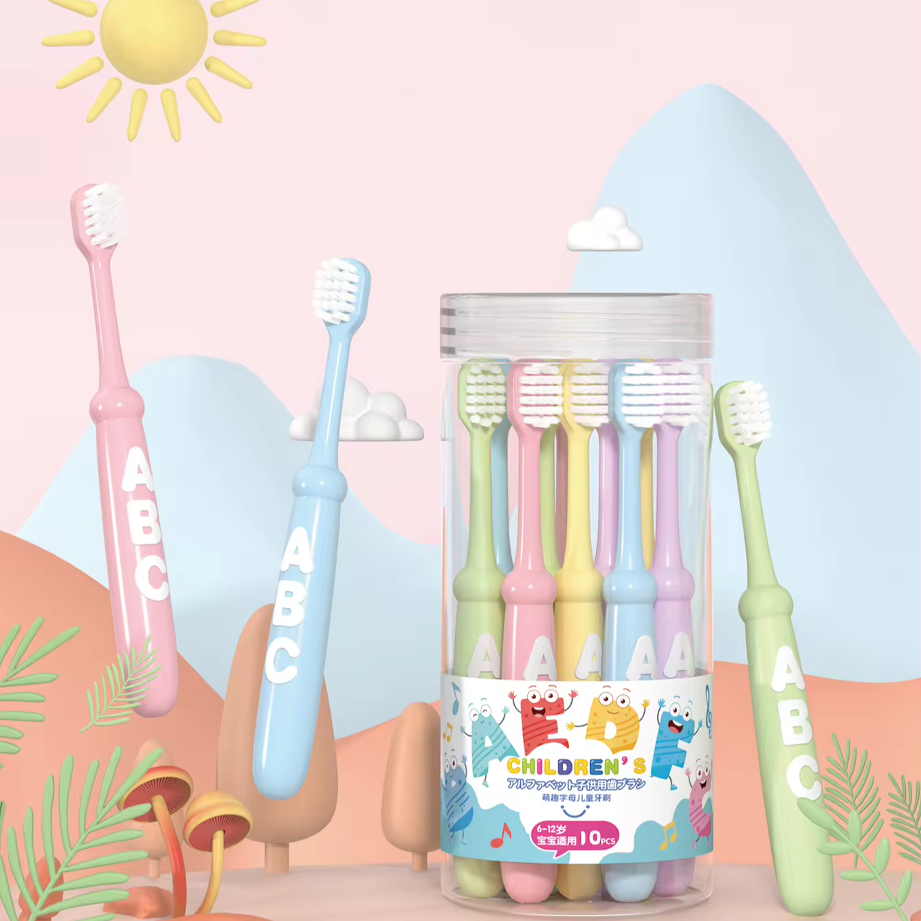 Brosses à dents pour enfants au design mignon personnalisé en gros avec logo à poils souples pour enfant 10 pièces d'emballage en boîte en plastique